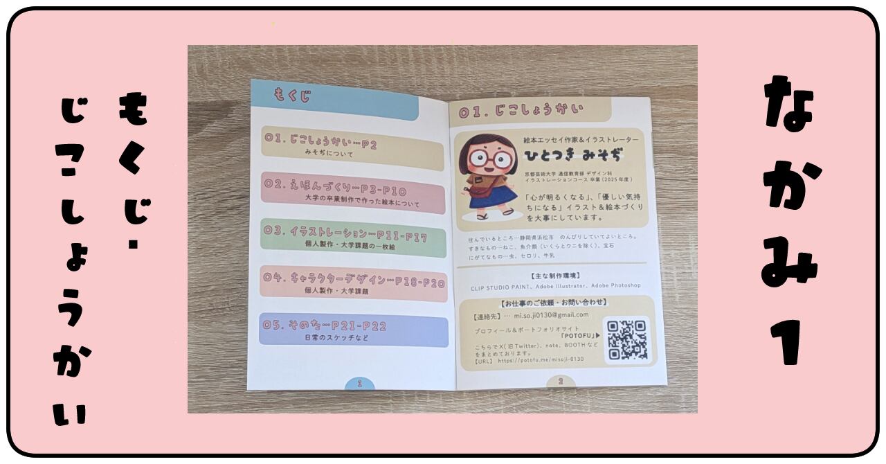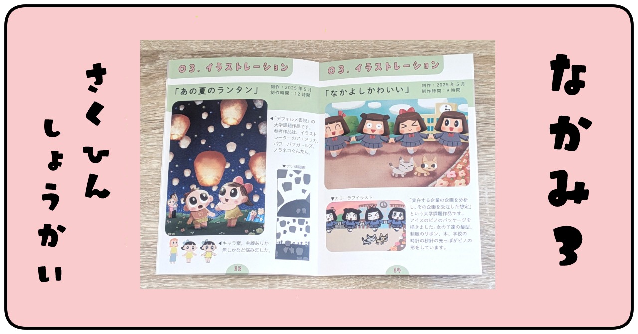 入学した2024年~2025年の間に制作したイラストを厳選し、デフォルメで描いた作品を主として1冊にまとめました。